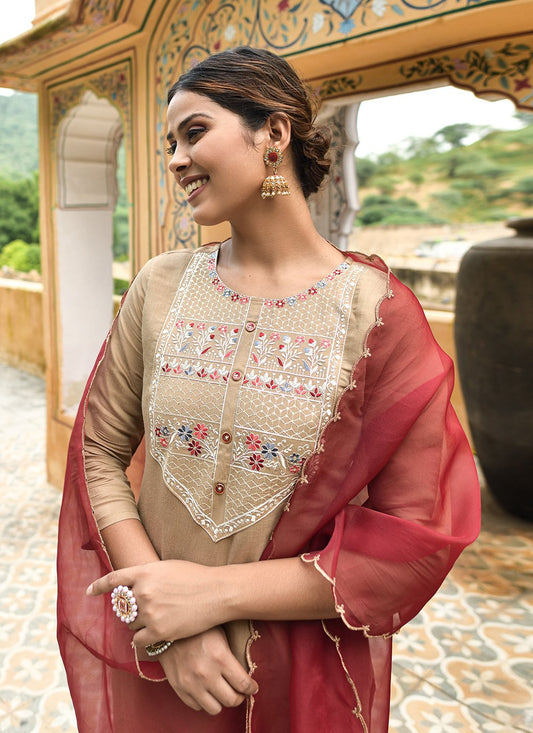 Salwar Suit Cotton Muslin Beige Embroidered
