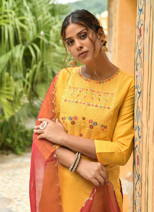 Salwar Suit Cotton Muslin Yellow Embroidered