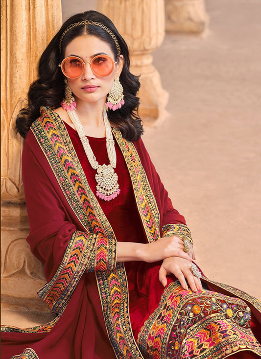 Palazzo Salwar Suit Velvet Maroon Embroidered