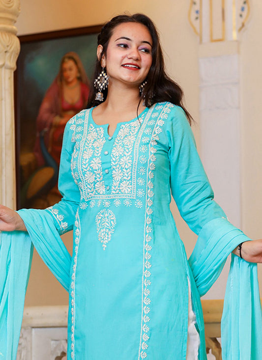 Salwar Suit Cotton Turquoise Embroidered Salwar