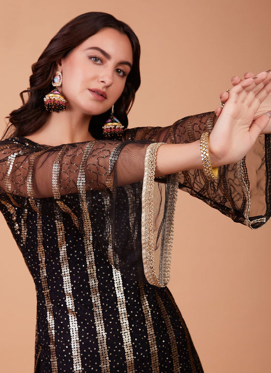 Sharara Set Faux Georgette Black Embroidered