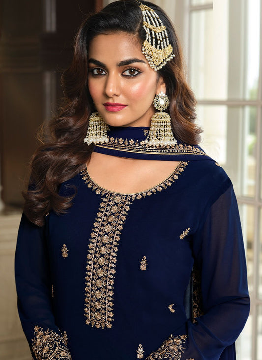Sharara Set Faux Georgette Blue Embroidered