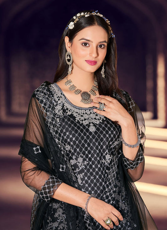 Pant Style Suit Net Black Embroidered