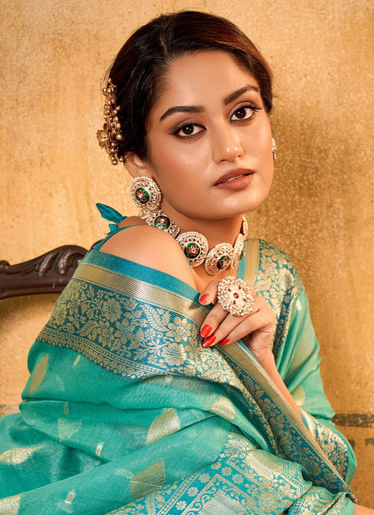 Trendy Saree Banarasi Silk Firozi Weaving