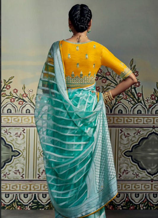 Contemporary Brasso Turquoise Fancy Work Saree