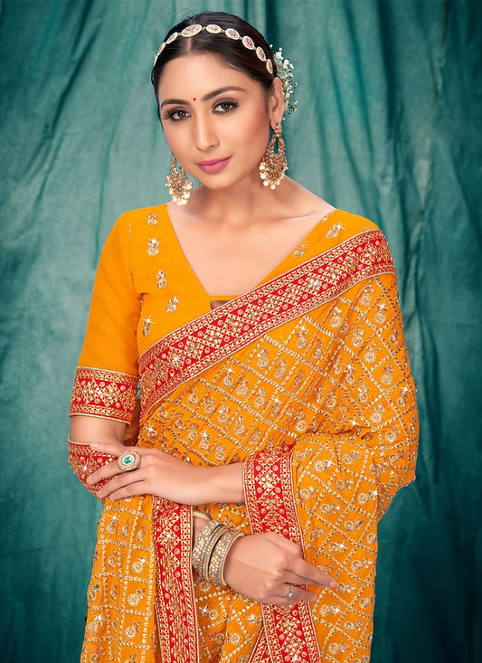 Classic Faux Georgette Orange Embroidered Saree