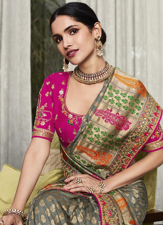 Classic Silk Grey Embroidered Saree