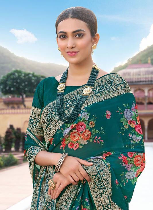Trendy Saree Shimmer Turquoise Embroidered Saree