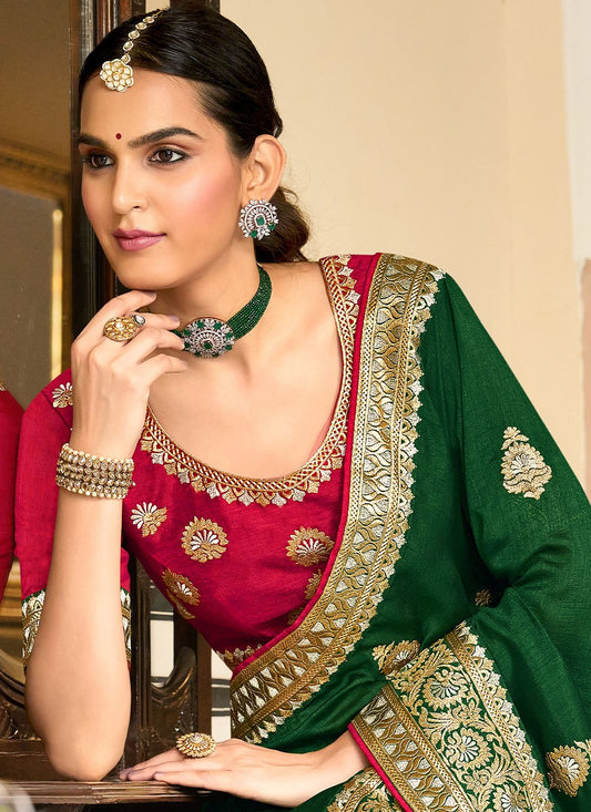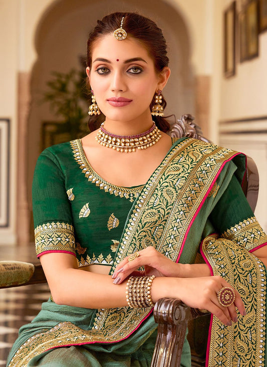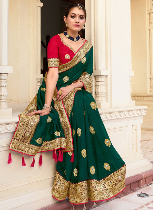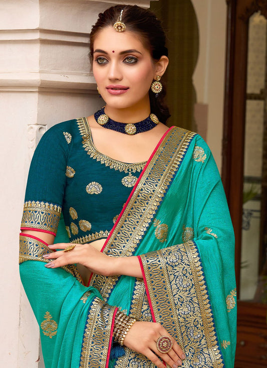 Designer Vichitra Silk Turquoise Embroidered Saree