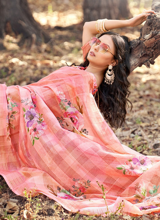 Trendy Saree Linen Tissue Peach Embroidered