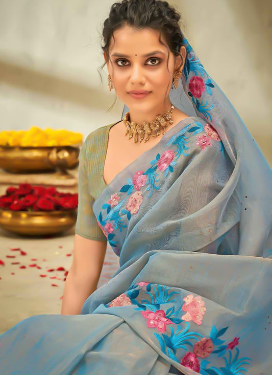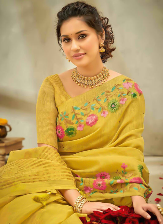 Contemporary Cotton Linen Yellow Embroidered Saree