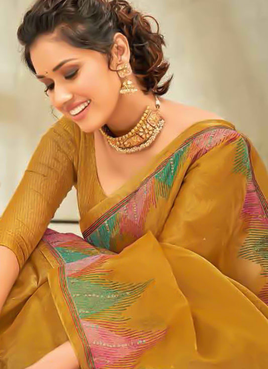 Contemporary Cotton Linen Mustard Embroidered Saree