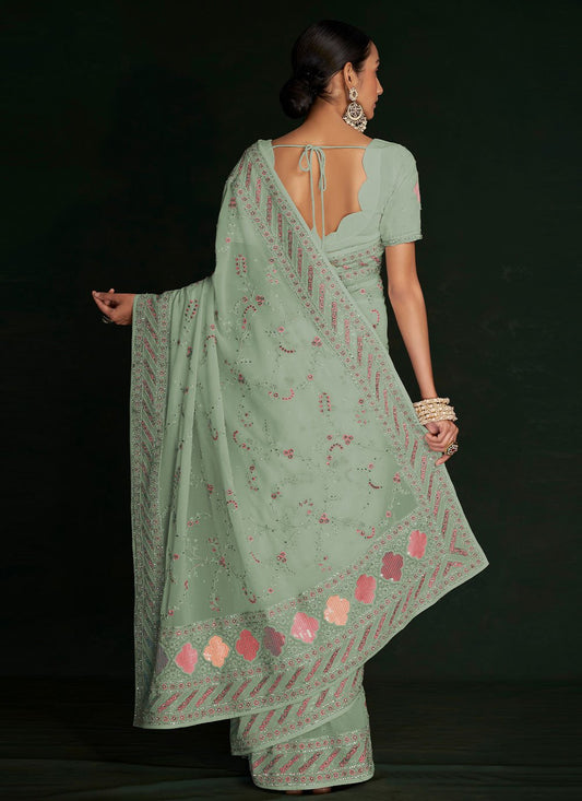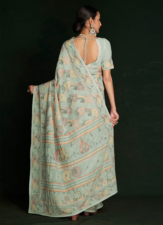 Trendy Saree Georgette Green Lucknowi Work