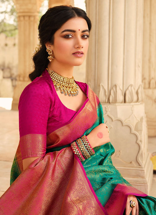 Classic Banarasi Silk Aqua Blue Patch