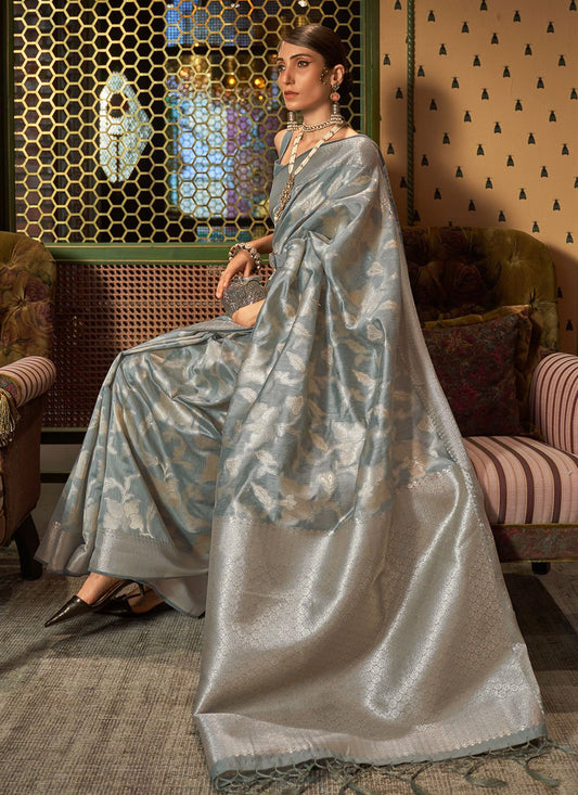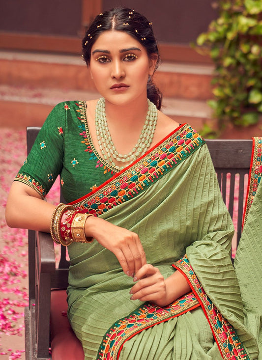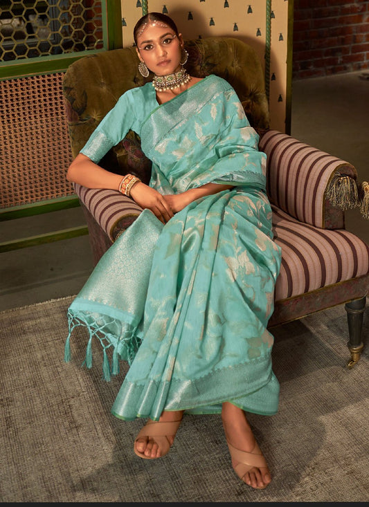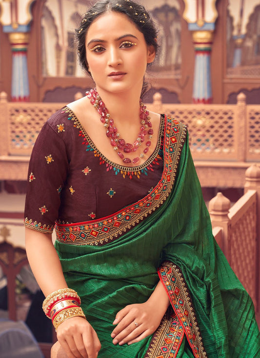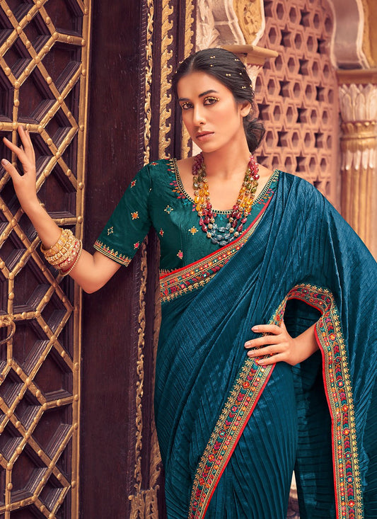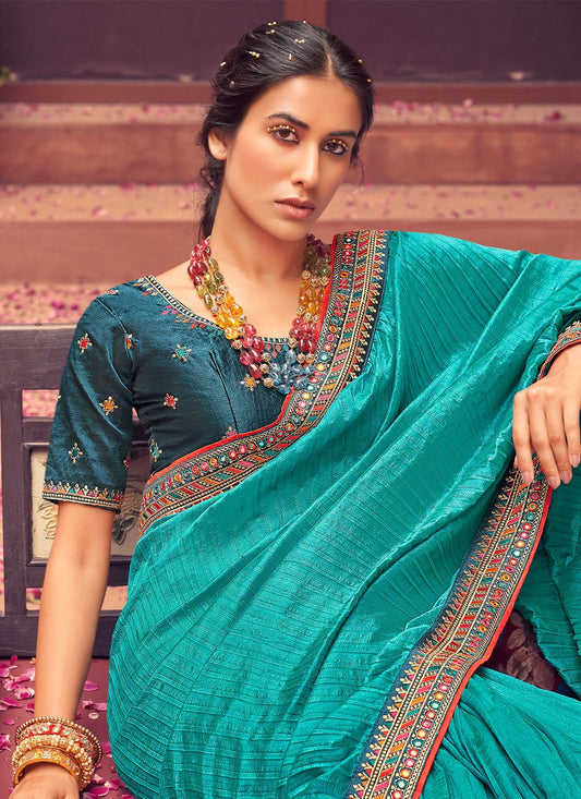 Classic Vichitra Silk Turquoise Embroidered Saree