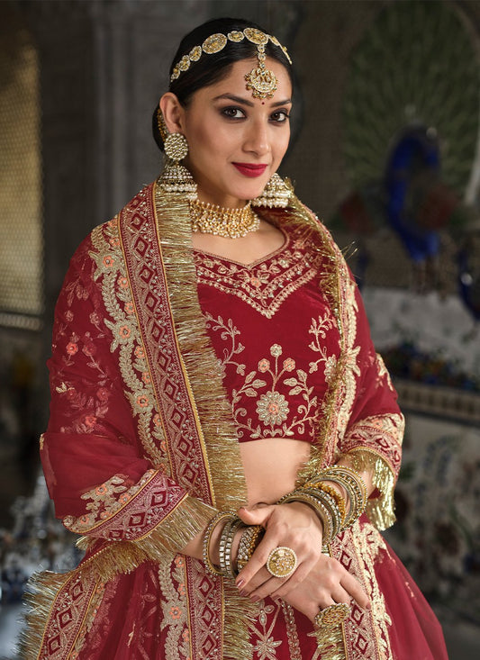 Lehenga Choli Velvet Red Embroidered Lehenga