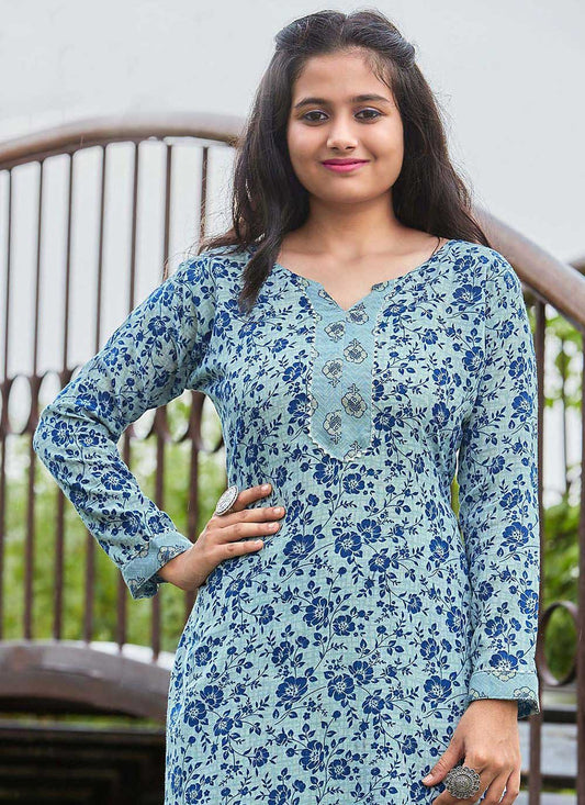 Casual Kurti Cotton Blue Embroidered Kurtis