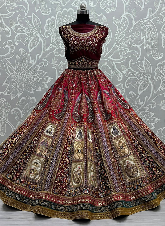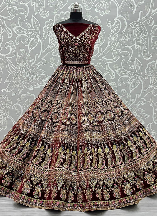 Lehenga Choli Velvet Maroon Embroidered Lehenga