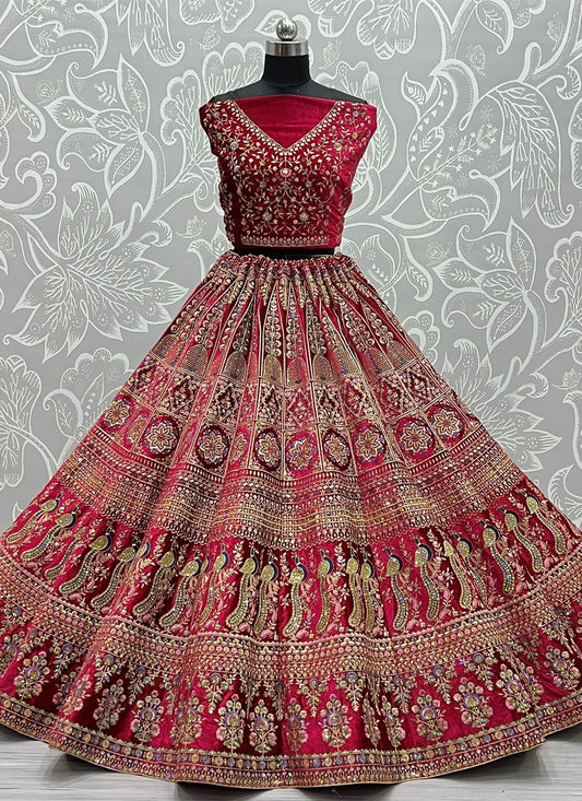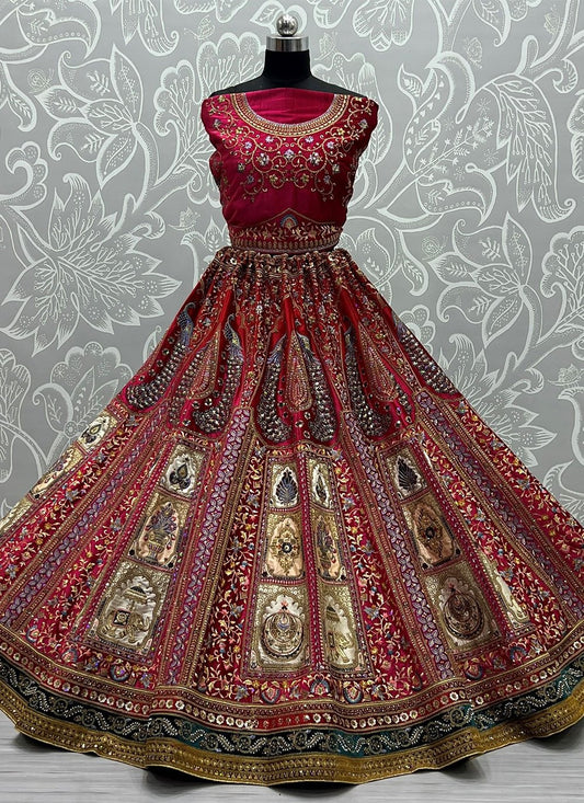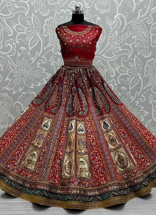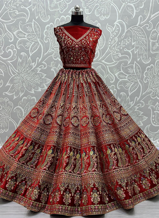 Lehenga Choli Velvet Red Embroidered Lehenga