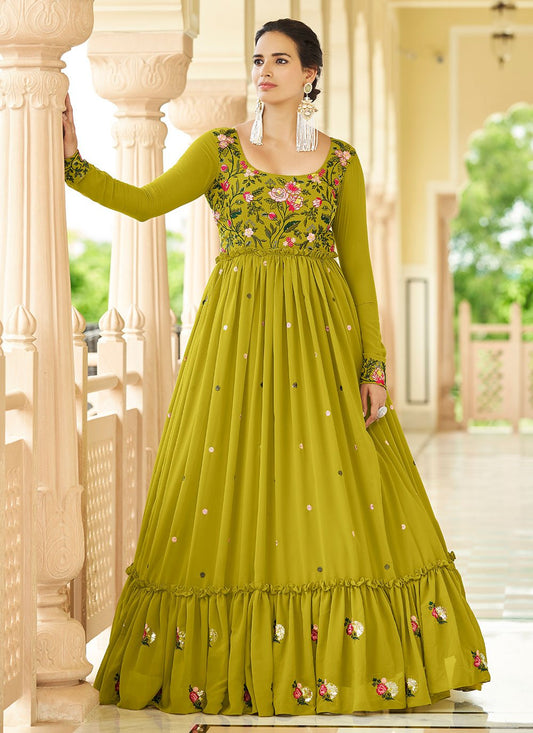 Gown Georgette Green Embroidered Gown