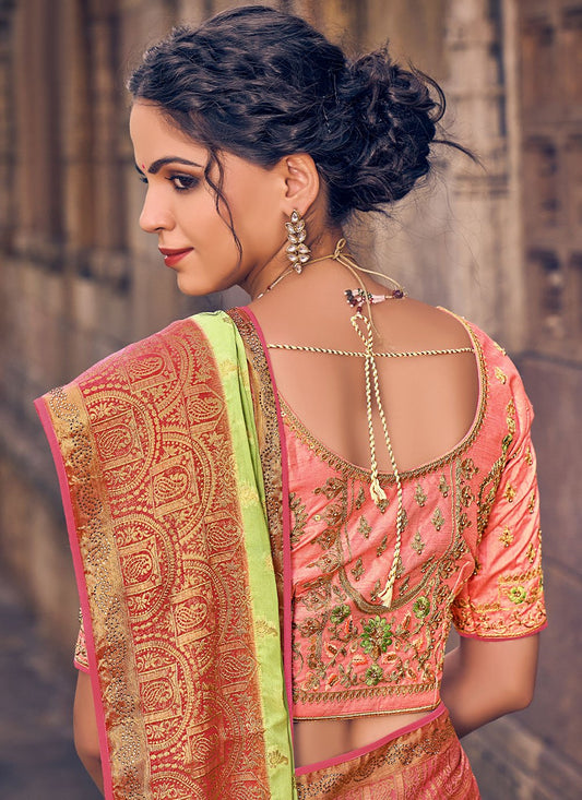 Designer Silk Green Orange Embroidered Saree