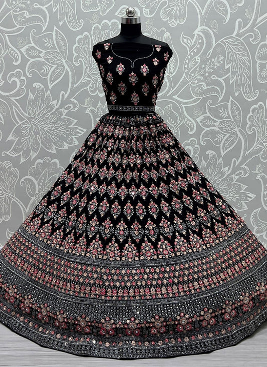 A Line Lehenga Satin Black Digital