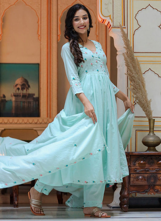 Salwar Suit Cotton Aqua Blue Embroidered