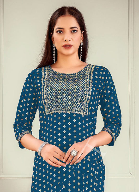 Casual Kurti Rayon Blue Embroidered Kurtis