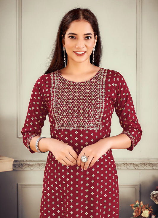 Designer Kurti Rayon Maroon Embroidered Kurtis