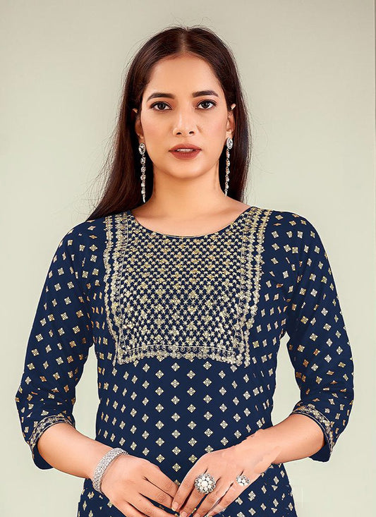 Designer Kurti Rayon Blue Embroidered Kurtis