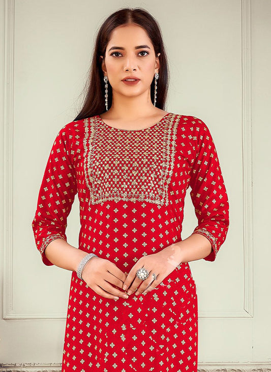 Casual Kurti Rayon Red Embroidered Kurtis