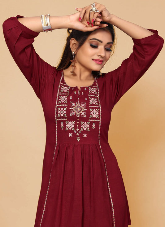 Casual Kurti Rayon Maroon Embroidered Kurtis