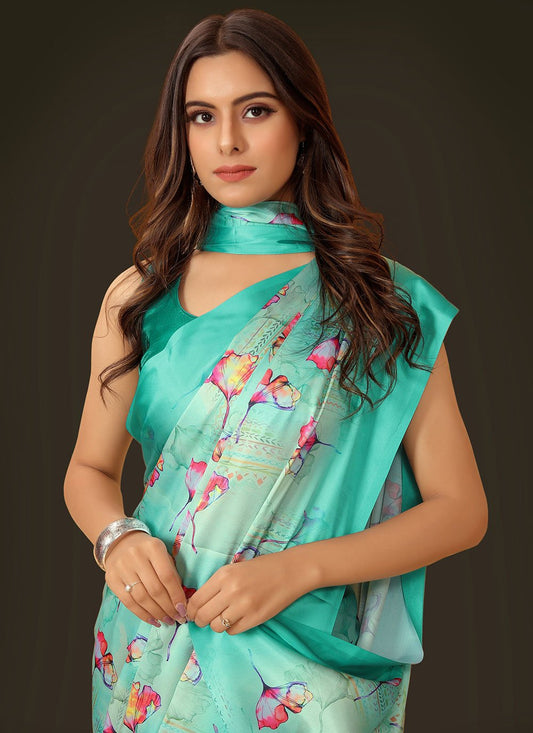 Classic Satin Turquoise Digital Print Saree