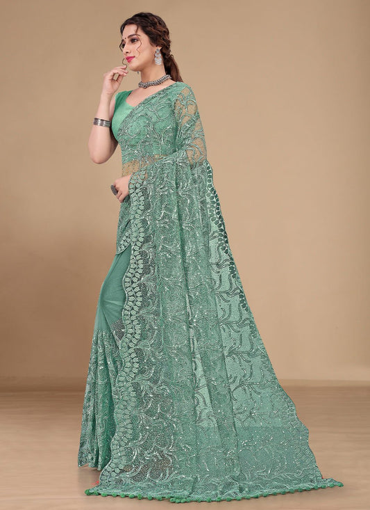 Classic Net Green Embroidered Saree