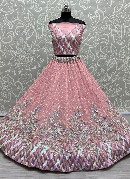 Lehenga Choli Chinon Pink Yellow Embroidered
