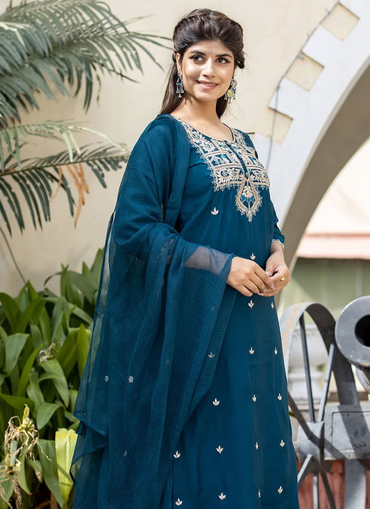Salwar Suit Chinon Teal Embroidered Salwar