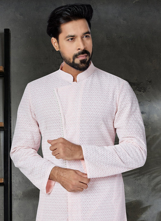 Kurta Pyjama Georgette Pink Embroidered Mens
