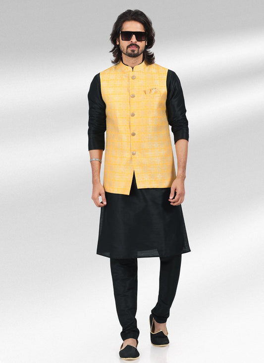 Nehru Jackets Cotton Yellow Print Mens