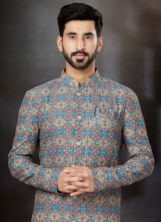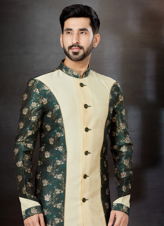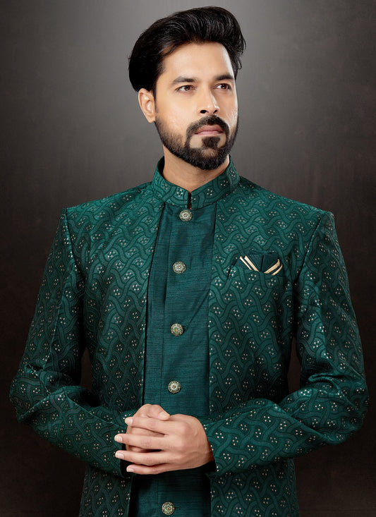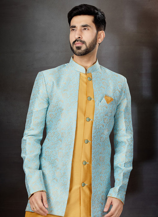 Indo Western Sherwani Jacquard Firozi Embroidered