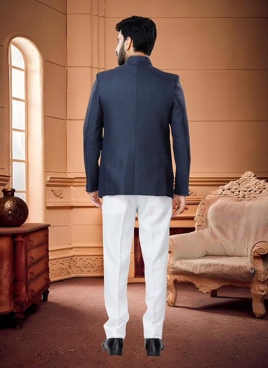 Jodhpuri Suit Jacquard Blue Embroidered Mens