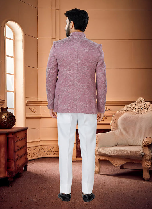 Jodhpuri Suit Jacquard Pink Embroidered Mens