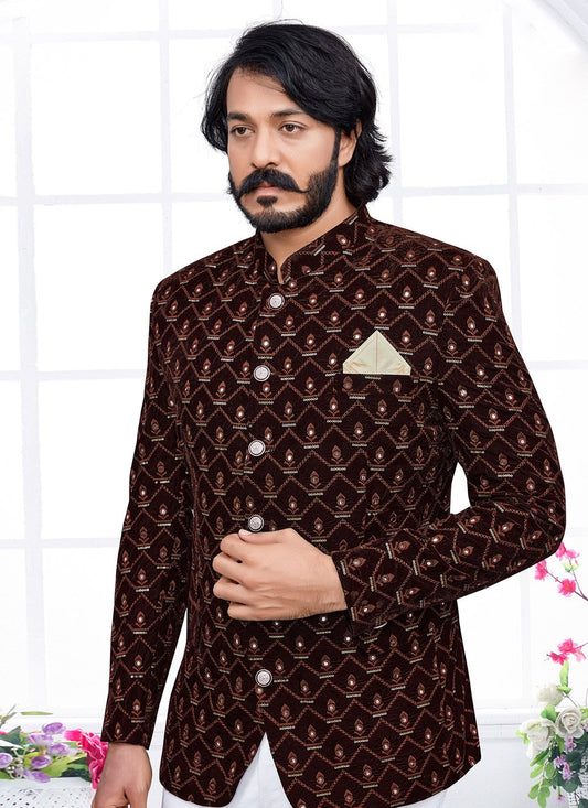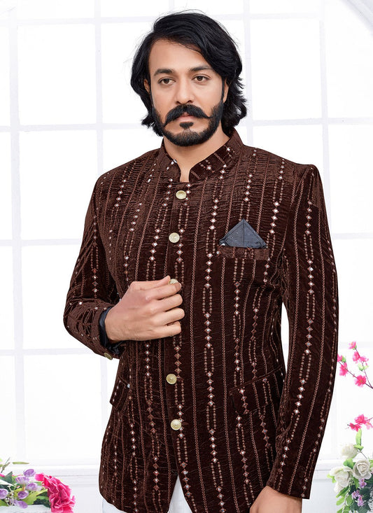 Jodhpuri Suit Velvet Brown Embroidered Mens