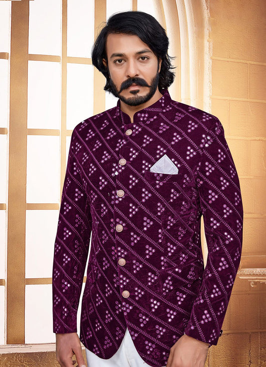 Jodhpuri Suit Velvet Purple Embroidered Mens