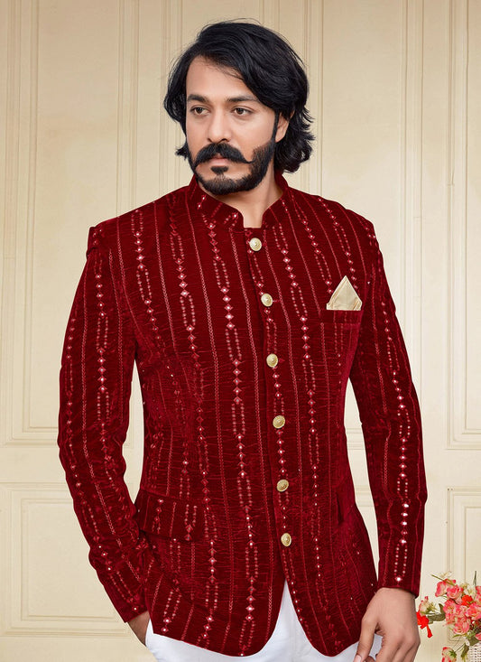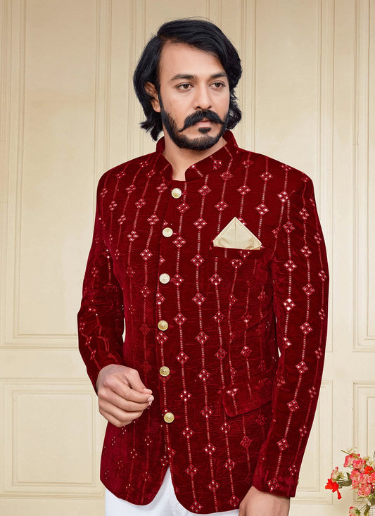 Jodhpuri Suit Velvet Maroon Embroidered Mens