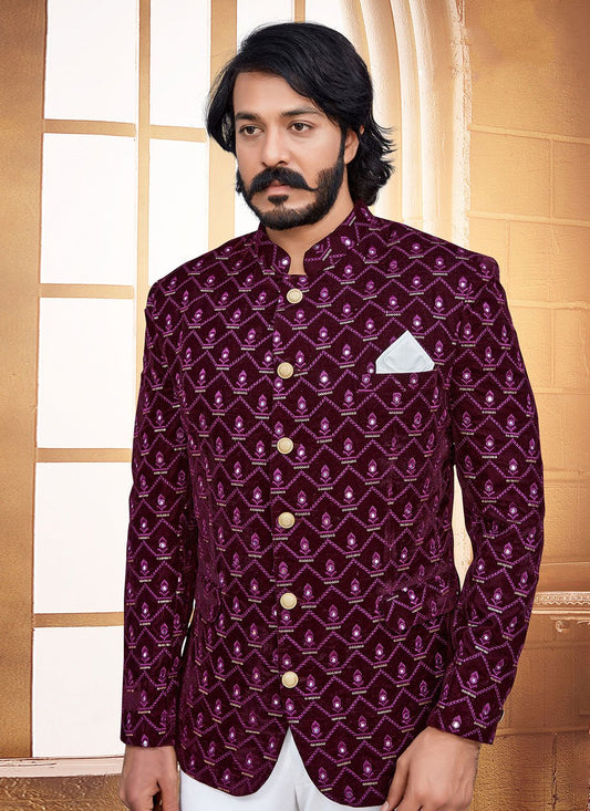 Jodhpuri Suit Velvet Wine Embroidered Mens