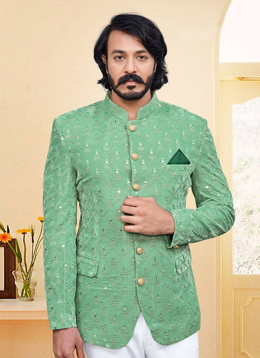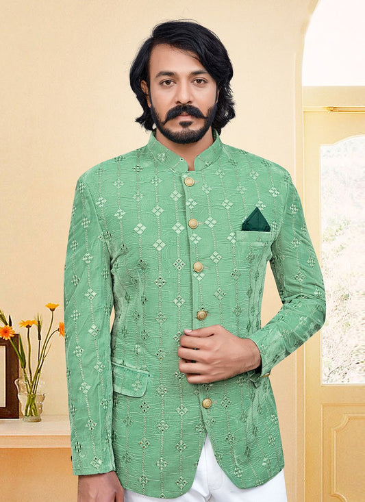 Jodhpuri Suit Velvet Green Embroidered Mens
