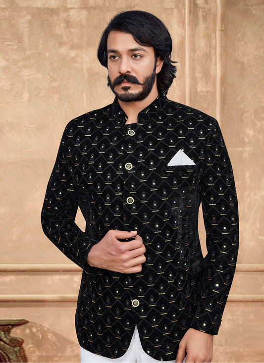 Jodhpuri Suit Velvet Black Embroidered Mens