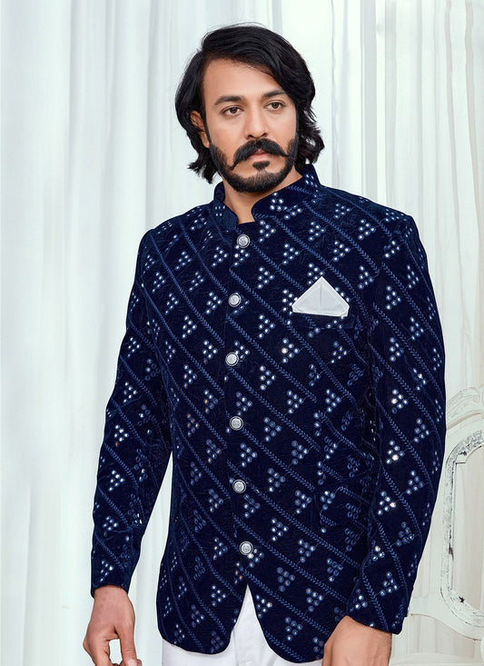 Jodhpuri Suit Velvet Blue Embroidered Mens