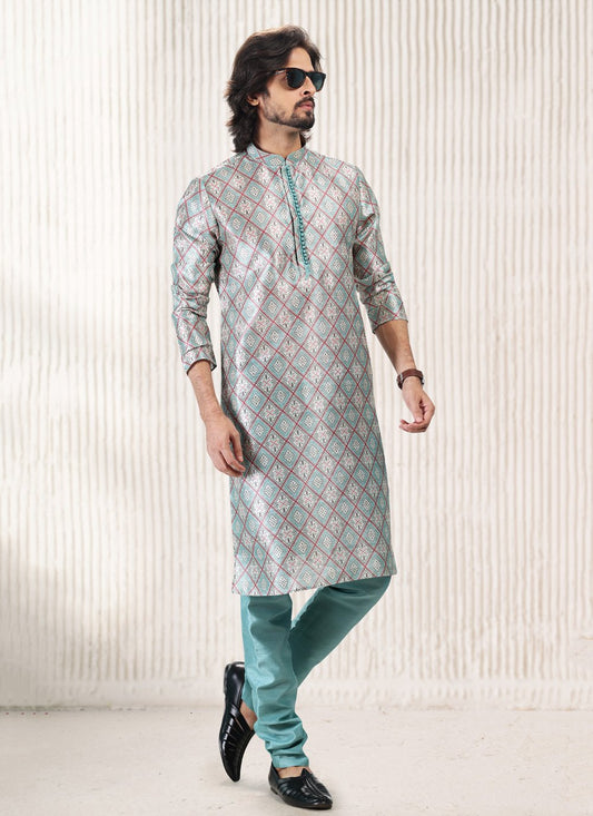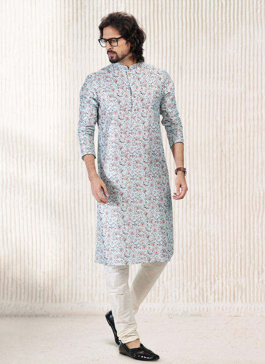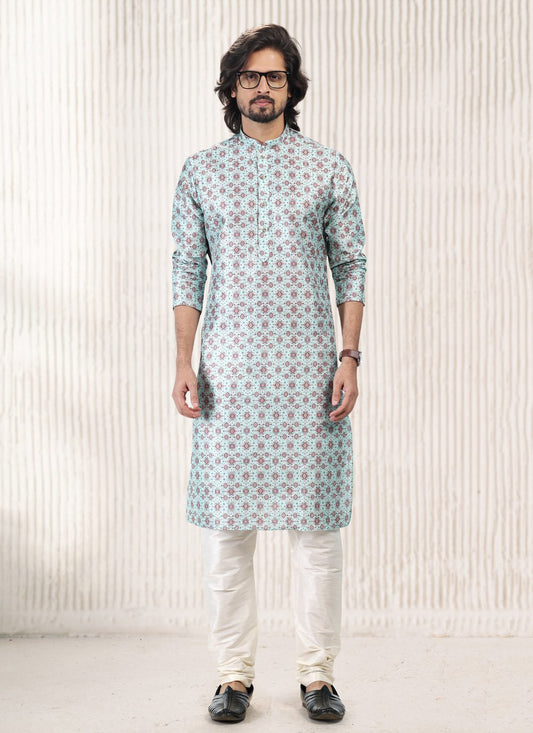 Kurta Pyjama Silk Blue Print Mens