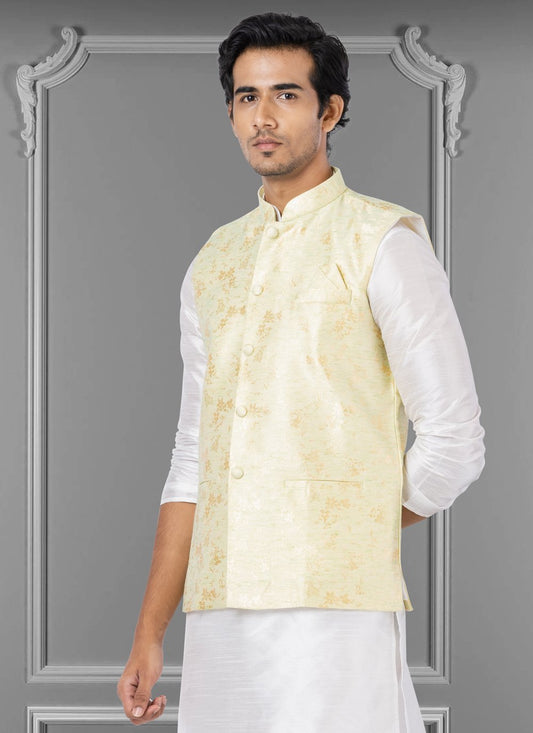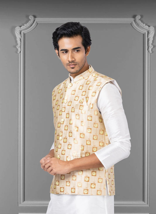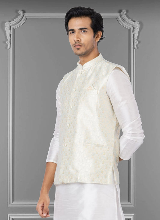 Nehru Jackets Banarasi Jacquard Cream Embroidered